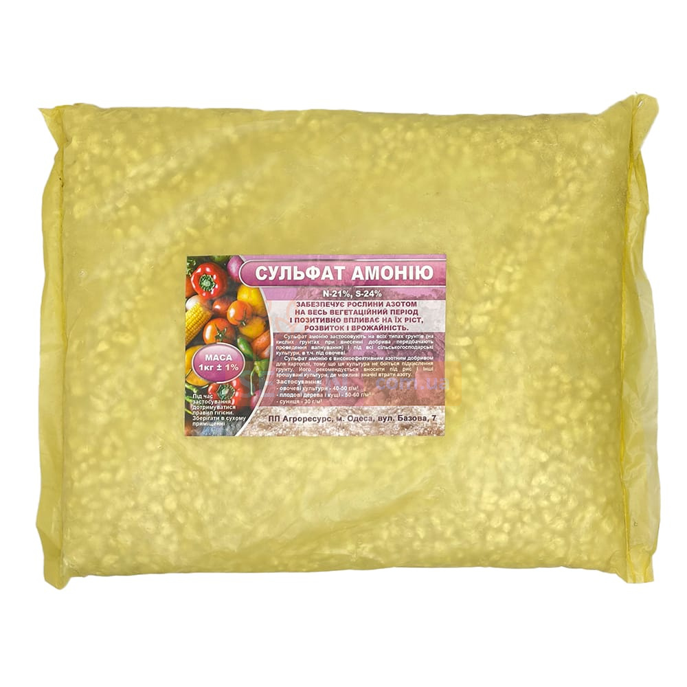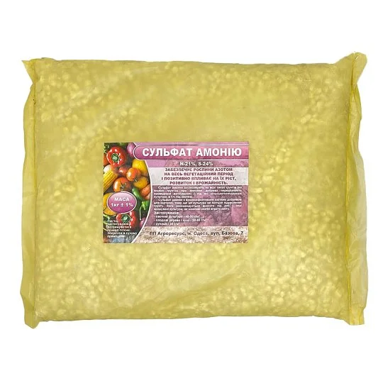 Сульфат амонію підходить для овочевих культур, плодових дерев, ягідників і картоплі. Забезпечує рослини повноцінним живленням, підвищує врожайність і покращує якість продукції.