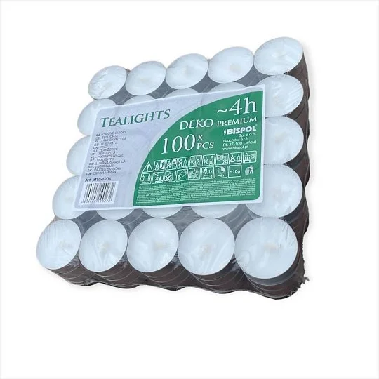Чайні свічки торгової марки BISPOL виробництво Польща виготовлені з безпечного, високоякісного харчового парафіну, що має унікальні властивості горіння. За допомогою чайних (плаваючих) свічок BISPOL у Вас є можливість створити унікальну романтичну обстановку для своєї другої половинки або підняти настрій, також дані свічки відмінно підходять для лампадок завдяки своїй унікальній, ергономічній формі. Час згоряння даних свічок коливається від 4 до 10 годин залежно від їхнього розміру.