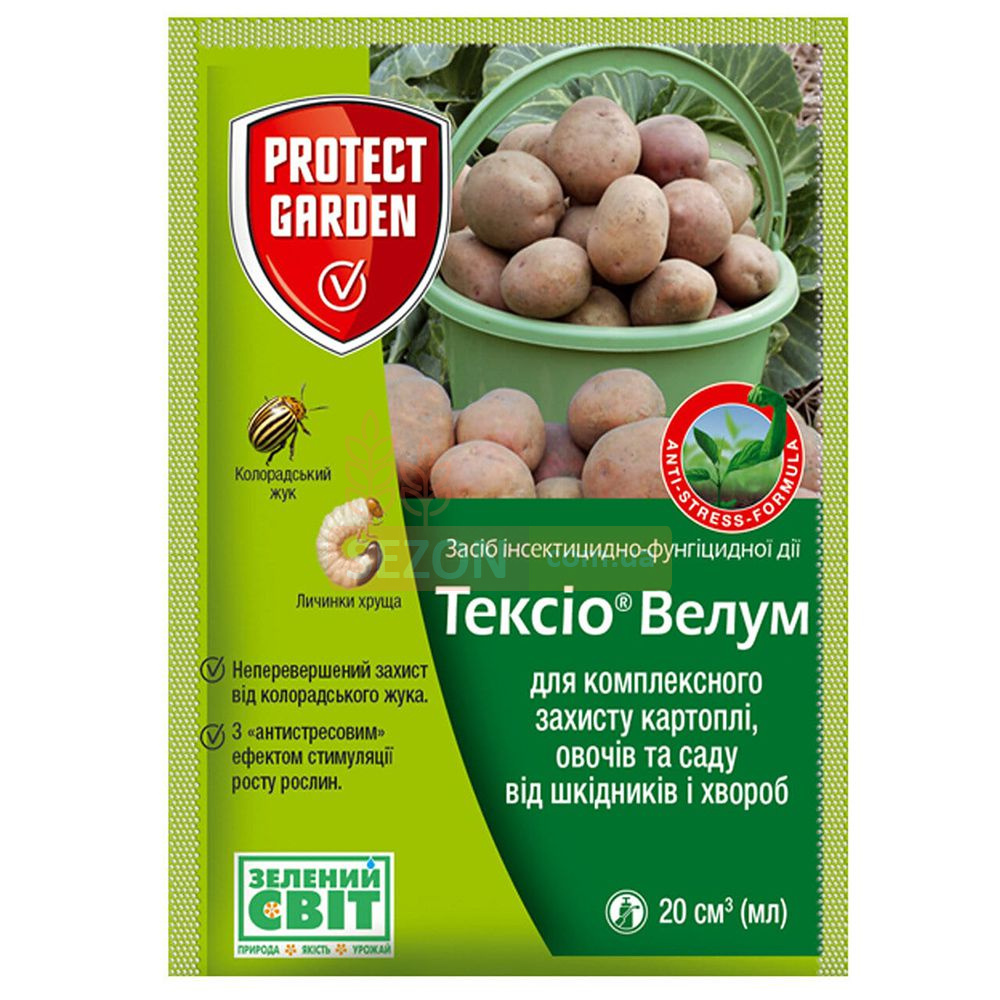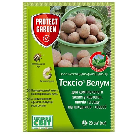 Інсекто-фунгіцидний обробник Тексио Велум Protect garden Якісний продукт, створений фірмою "Bayer", застосовується для трактування сіянців, включаючи: картопля, помідори, яблуко, виноград, полуниця, агрус, персик, вишня, черешня, цибуля, часник, капуста, огірки , кавун, диня, троянда, ріпак, горох, редька, селера, баклажан, буряк, ячмінь, зливу, груша, з метою убезпечення від комах та хвороб під час початкового росту рослин. Засіб ефективно бореться зі шкідниками, такими як колорадський жук, попелиця, трипс, совка, квіткоїд, довгоносик, плодожерка, пиляльник, моль, листовійка, муха, блошка, білокрилка, кліщ, клоп, щитівка, цикадка, мотузка, скло , а також із захворюваннями, такими як рідоктоніоз, фітофтороз, септоріоз, оідіум, мілдью, альтернаріоз, плямистості, антракноз, іржа, хлороз, борошниста роса, бактеріоз, моніліоз, фомоз, альтернаріоз, переноспороз. Засіб проникає в рослину, захищає надземну частину та кореневу систему, має стимулюючі властивості росту, що забезпечує збільшення врожаю та збільшує стійкість рослин до несприятливих умов навколишнього середовища.