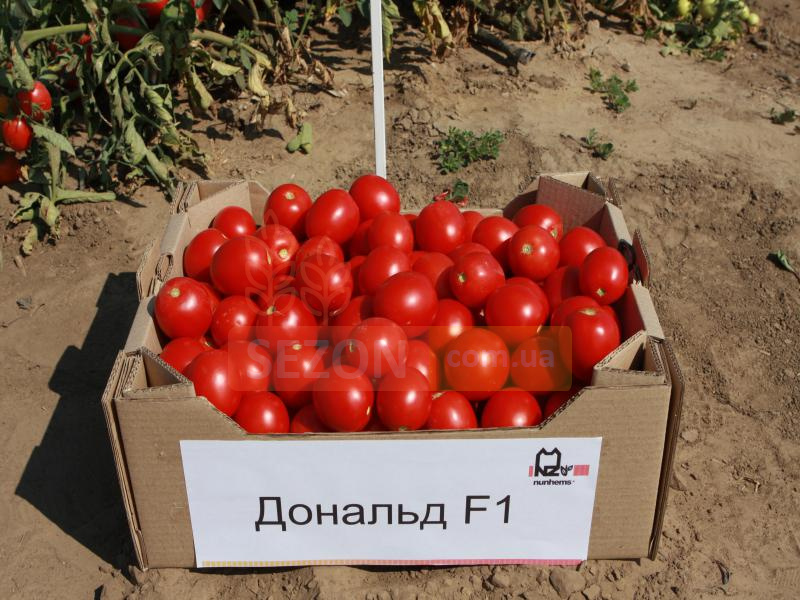 Томат Дональд F1 - суперранній промисловий томат, що відмінно підходить для цільноплідного консервування, переробки, а також для свіжого ринку. Кущ рослини компактний, плоди округло-овальні, що відрізняються відмінною траспортабельністю. Вид: кущовий. Кількість насіння за 1 г: 250-300 шт. Термін вегетації: 80-95 днів. Маса плода: 45-55 г.