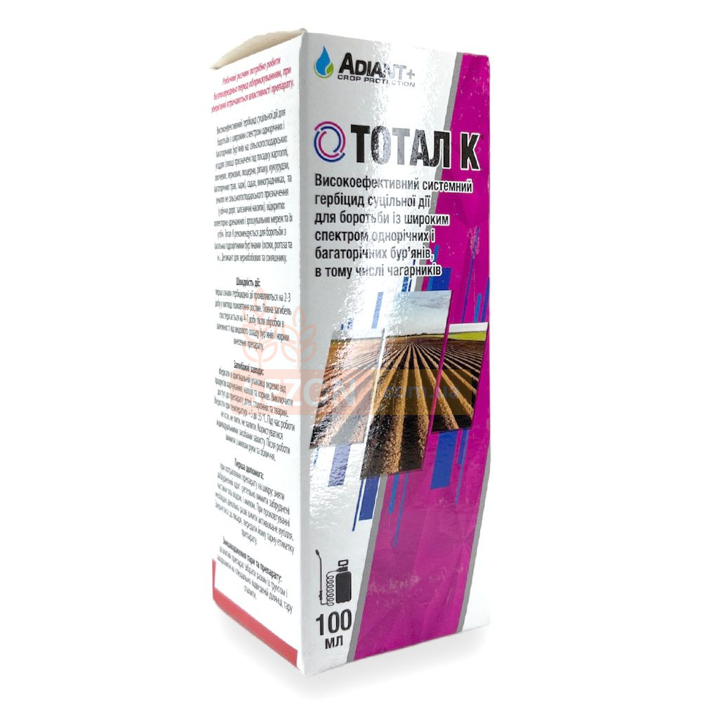 Тотал К — системний гербіцид суцільної дії для боротьби з широким спектром однорічних та багаторічних бур'янів на сільськогосподарських угіддях та землях несільськогосподарського призначення. Десикант зернобобових та соняшнику.