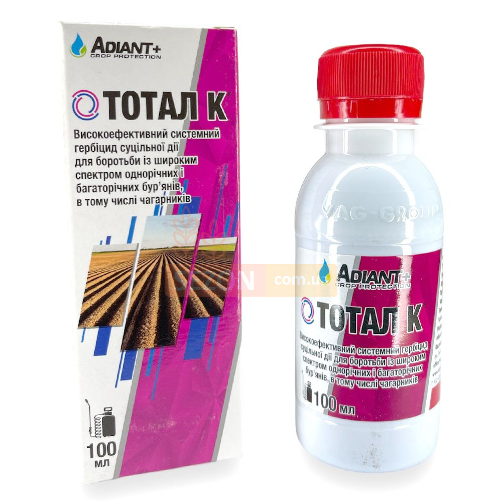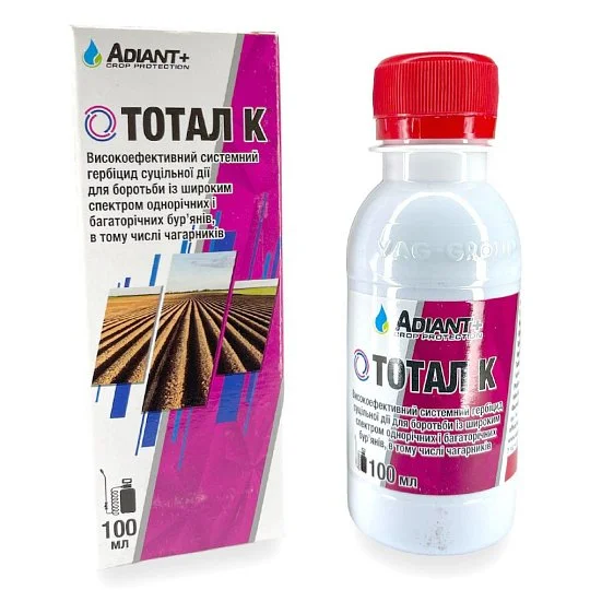 Тотал К — системний гербіцид суцільної дії для боротьби з широким спектром однорічних та багаторічних бур'янів на сільськогосподарських угіддях та землях несільськогосподарського призначення. Десикант зернобобових та соняшнику.