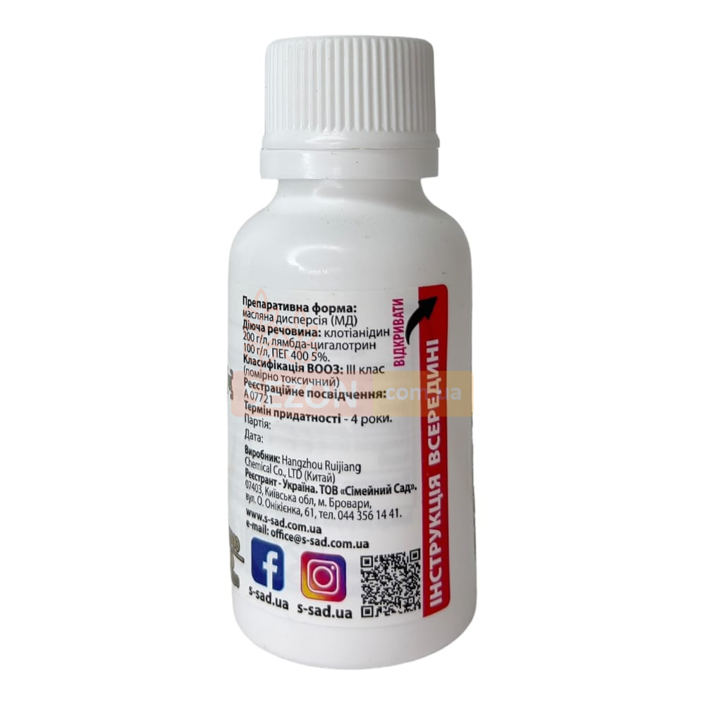 | Діюча речовина: | клотіанідин, 200 г/л + лямбда-цигалотрін, 100 г/л + ПЕГ 400 5% |