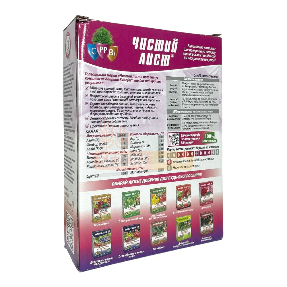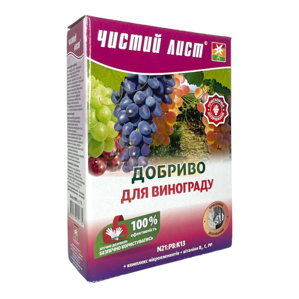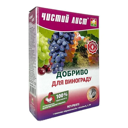 Добриво «Чистий лист» призначене для виноградної лози та забезпечує її всіма необхідними елементами в критичні фази росту й плодоношення. Продукт сприяє підвищенню врожайності, покращує якість ягід, прискорює дозрівання, формує міцні пагони та стійкі до морозів бруньки. Підходить для використання в різних кліматичних умовах і чудово поєднується з органічними добривами.
