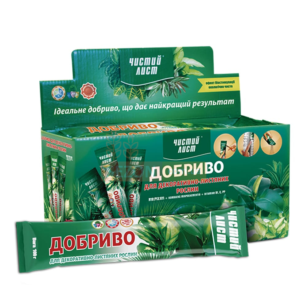 Добриво «ЧИСТИЙ ЛИСТ» забезпечує повноцінне живлення рослин, компенсуючи дефіцит найважливіших макро- та мікроелементів. Завдяки його застосуванню ваші рослини стануть більш стійкими до несприятливих погодних умов, заморозків, хвороб і гнилі, а також отримають зміцнену кореневу систему.