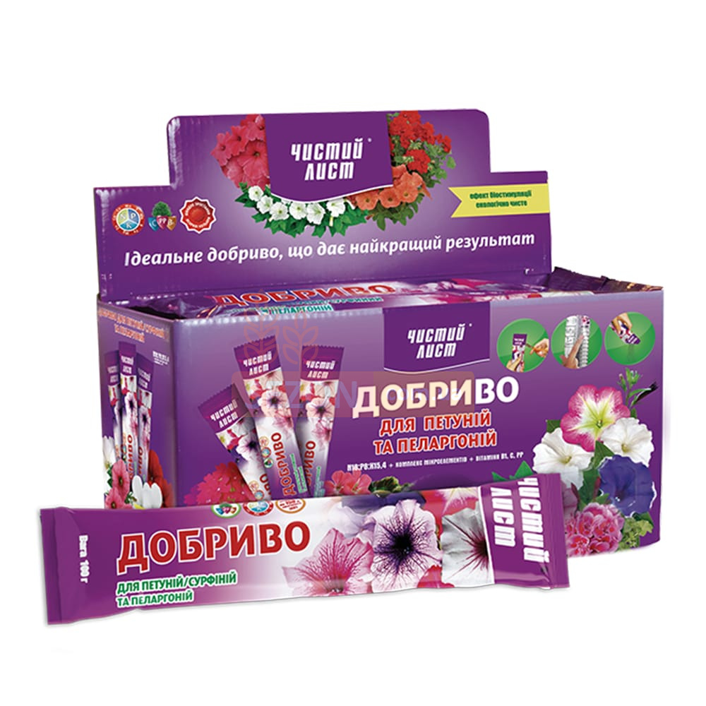 Добриво «Чистий Лист» спеціально розроблене для декоративних квітучих культур — петуній, сурфіній та пеларгоній. Воно забезпечує повноцінне живлення на всіх етапах росту і цвітіння, покращує зовнішній вигляд рослин та підвищує їхню стійкість до зовнішніх факторів.