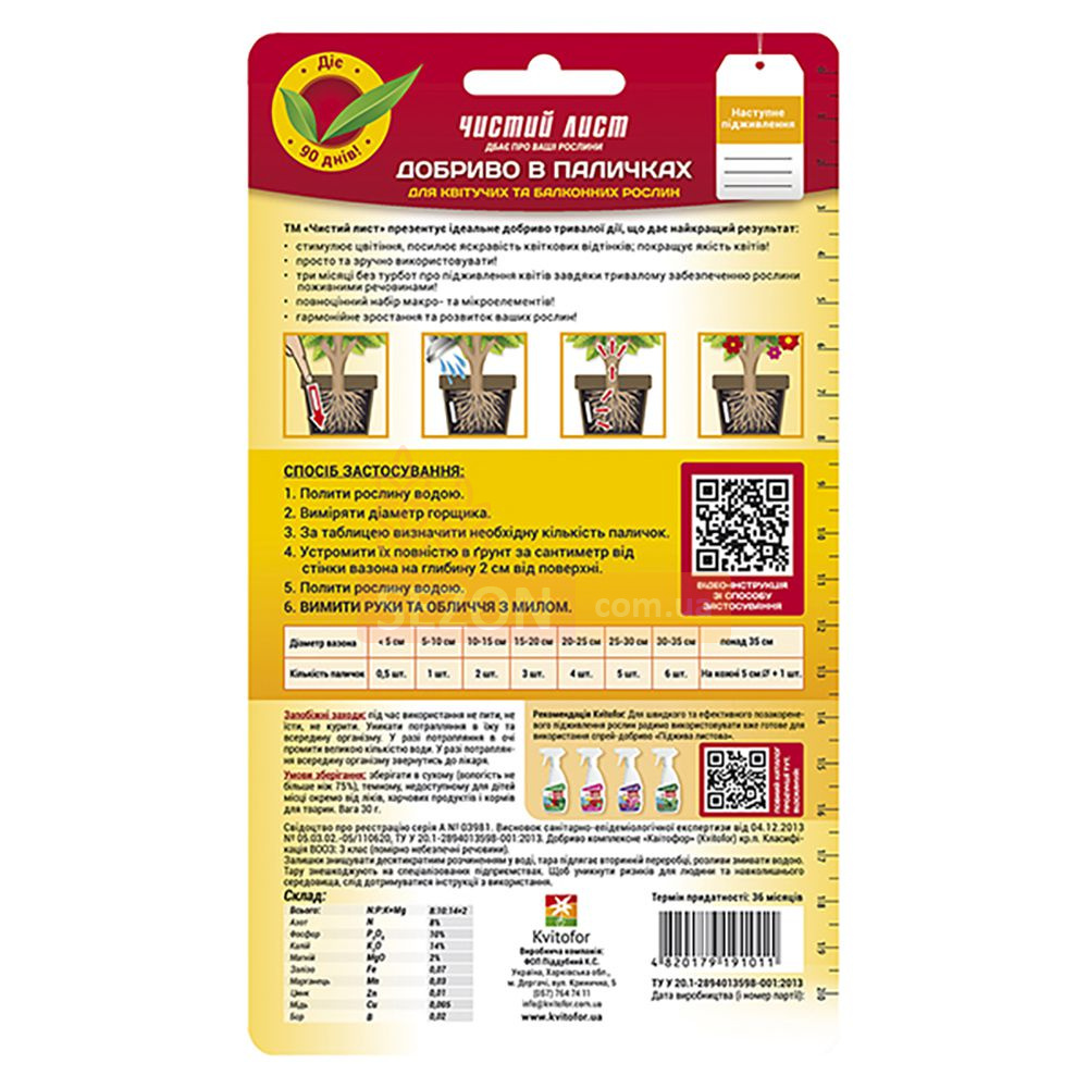 Добриво тривалої дії «Чистий лист» розроблено для декоративних та кімнатних рослин. Воно забезпечує повноцінне живлення протягом трьох місяців і допомагає сформувати густу, соковиту й яскраву зелень. Добриво зручне у використанні та не потребує частих підживлень, що особливо зручно для зайнятих садівників.