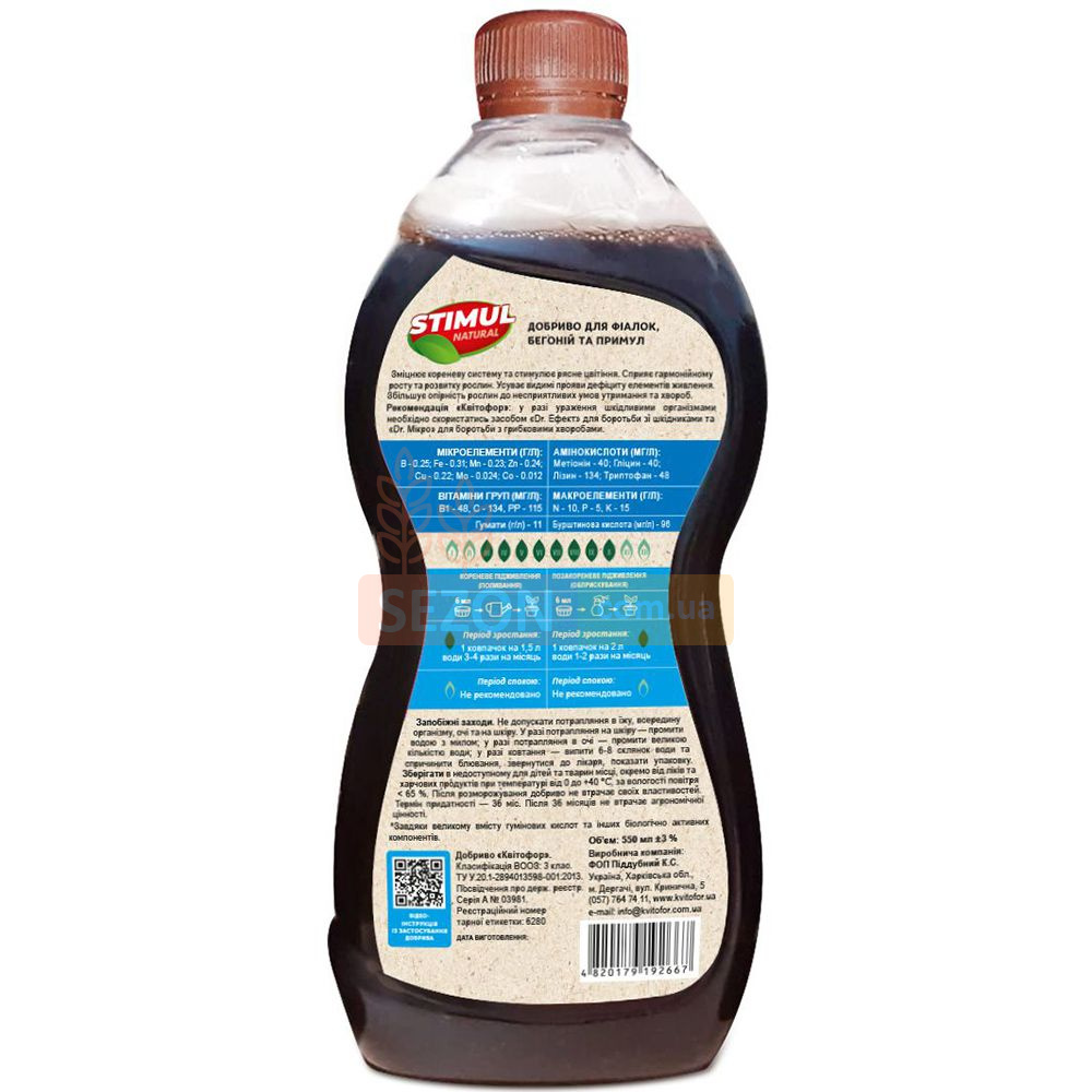 STIMUL NATURAL використовується для кореневого підживлення фіалок, бегоній і примул. Добриво рекомендоване до застосування як у фазі росту, так і в період спокою. Під час вегетації воно підтримує активний розвиток і цвітіння, а в період спокою сприяє відновленню та підтриманню життєздатності рослин.