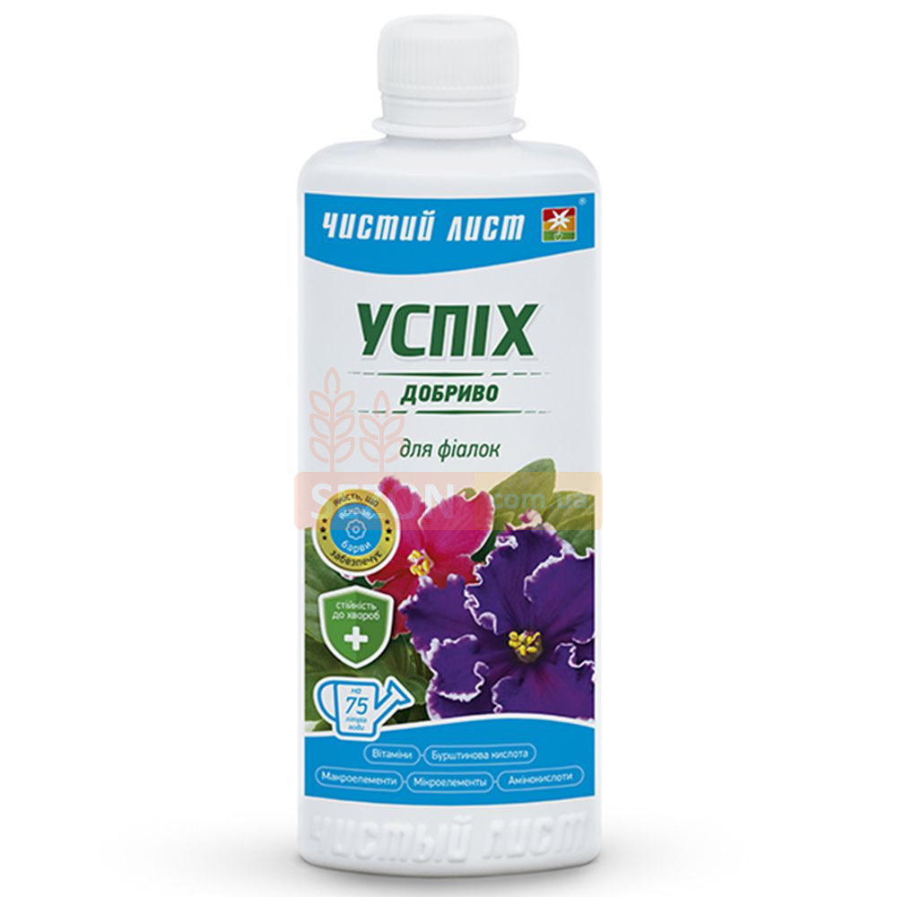 Добриво Успіх розроблене спеціально для сенполій (фіалок) та інших кімнатних рослин із чутливою кореневою системою. Його склад включає макро- і мікроелементи, вітаміни, амінокислоти та бурштинову кислоту, які підтримують ріст, цвітіння й загальне здоров’я рослин.
