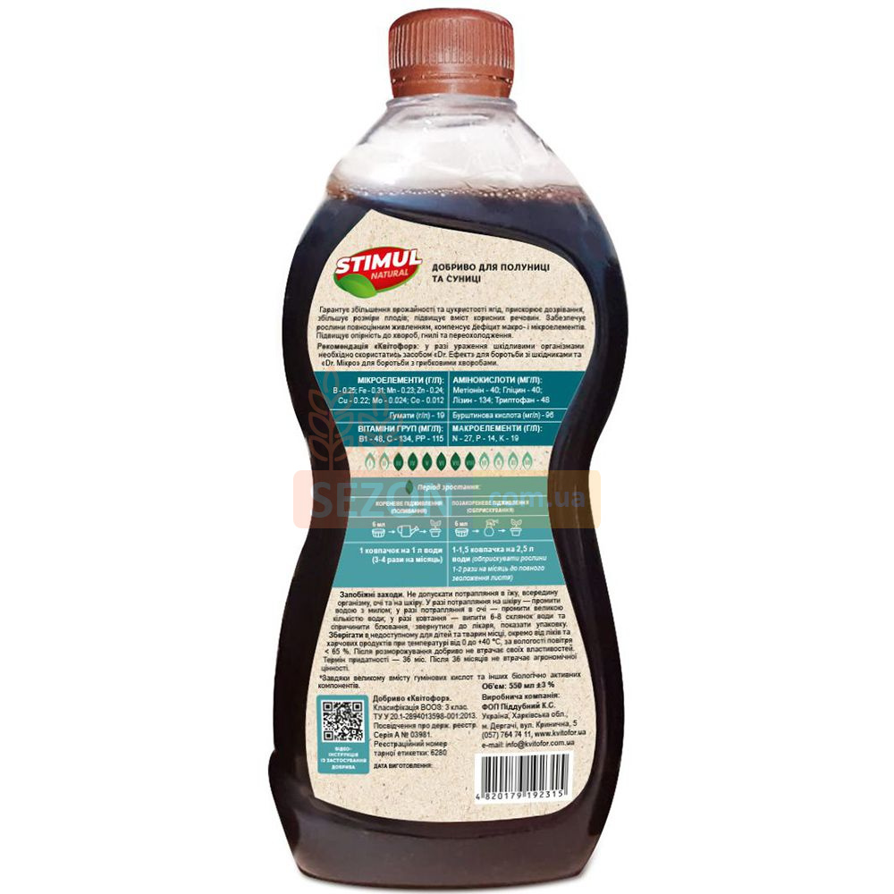 STIMUL NATURAL — це ефективний органічний засіб, спеціально розроблений для підживлення полуниці та суниці. Він забезпечує рослини всіма необхідними поживними речовинами, сприяє підвищенню врожайності, покращує солодкість і розміри ягід, а також пришвидшує їхнє дозрівання.