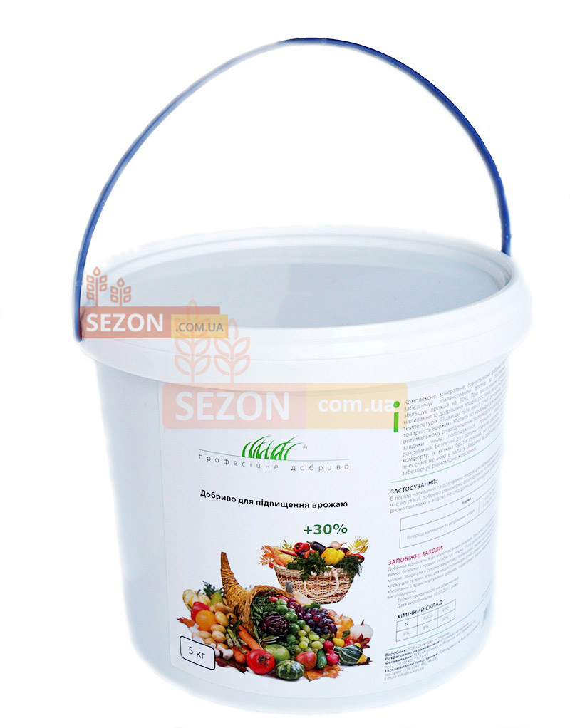 Добриво для підвищення врожаю створено для збалансованого догляду за рослинами протягом усього сезону. Добриво збільшує якість та кількість врожаю, підвищує вміст сухої речовини плодів. Виготовлено у вигляді безпечних гранул, які вносять у ґрунт для підживлення рослин. Спосіб застосування: у період наливу та дозрівання плодів 5 кг на 150-250 кв.м. Склад: N – 9%, Р205 – 8%, К20 – 30%.