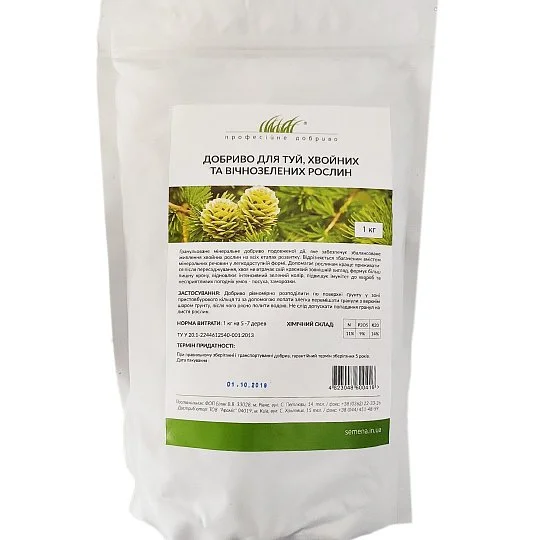 Добриво для туй, хвойних та вічнозелених створено для збалансованого догляду за хвойними протягом усього сезону. Добриво підвищує стійкість вічнозелених до різних кліматичних факторів, підвищує імунітет рослин, позитивно впливає на окрас.Вироблено у вигляді безпечних гранул, які вносять у ґрунт для підживлення рослин. Спосіб застосування: у період вегетації 5 кг на 25-50 дерев. Склад: N – 11%, Р2О5 – 9%, К20 – 14%.