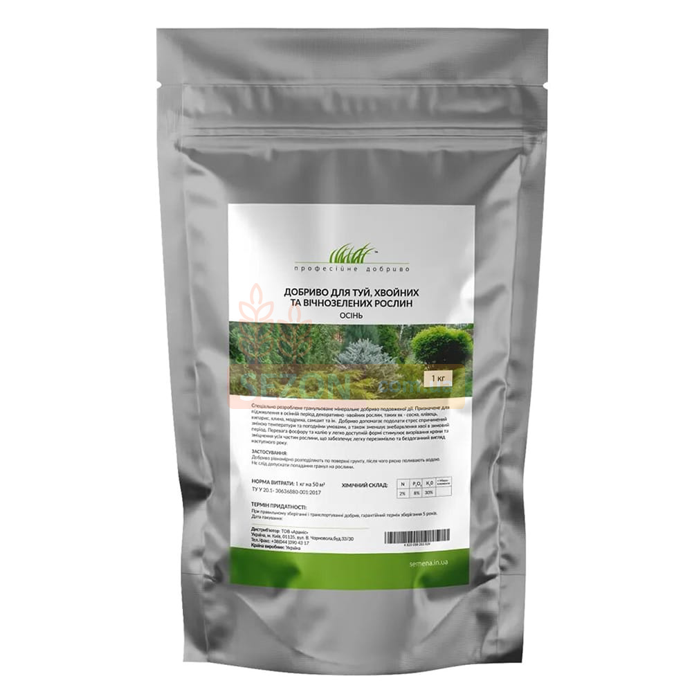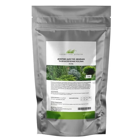 Добриво для туй, хвойних та вічнозелених створено для збалансованого догляду за хвойними протягом осіннього періоду. Добриво підвищує стійкість вічнозелених до різних кліматичних факторів, підвищує імунітет рослин, позитивно впливає на окрас.Вироблено у вигляді безпечних гранул, які вносять у ґрунт для підживлення рослин. Спосіб застосування: у період вегетації 1 кг на 50 кв.м. Склад: N – 2%, Р2О5 – 8%, К20 – 30%.