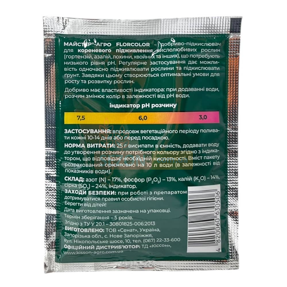 Мастер®-Агро Florcolor — добриво для кореневого підживлення кислолюбивих рослин, створене для зниження рН ґрунту. Завдяки йому можна успішно вирощувати рослини на ґрунтах з нейтральною або слабощелочною реакцією. Індикатор кислотності дозволяє точно контролювати кислотність, створюючи розчин потрібного рівня рН для різних рослин.