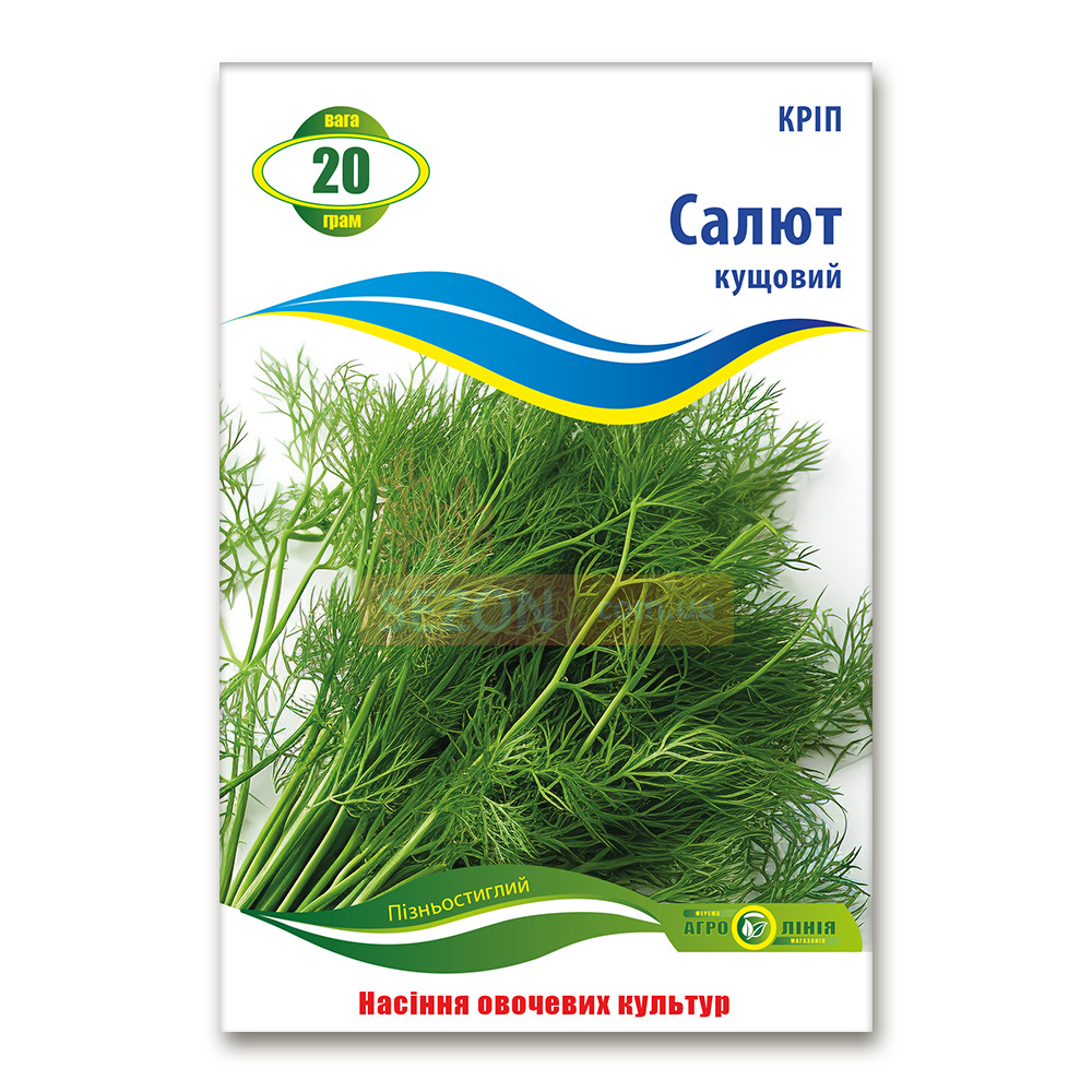 Опис зелені: Кріп "Салют" має насичені зелені, ароматні листки з чудовими смаковими якостями. Підходить для використання у свіжому вигляді, консервації та заморожування.