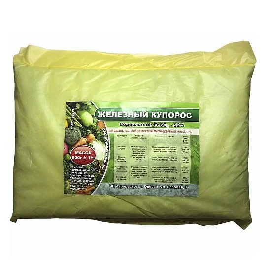 Залізний купорос (сульфат заліза, FeSO₄·7H₂O) являє собою зеленувато-блакитні кристали. Масова частка сульфату заліза (II) становить близько 53%. Продукт застосовується у вигляді розчинів різної концентрації залежно від цілей обробки.